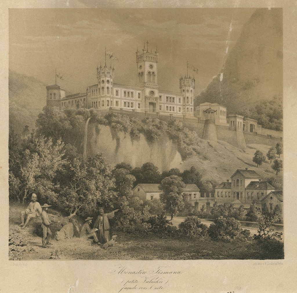 BISERICA Mănăstirii Tismana este construită în stil bizantin, direct pe stâncă, având ziduri de piatră foarte groase. Planul se compune dintr-un pridvor dezvoltat, un nartex redus, naos triconc şi altar. Ea se diferenţiază de celelalte monumente din Ţara Românească atât prin existenţa pridvorului ce oferă locaşului o prezenţă masivă, solid ancorată pe stânca Stârminei, cât şi prin înălţimea diferită a celor trei compartimente ale bisericii, ascendentă de la pridvor către naos, exprimată gradual prin cele trei turle crescânde în înălţime, care conferă naosului o sporită monumentalitate.
